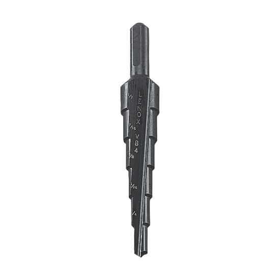 LENOX® Vari-Bit® Step Drill Bit, Vari-Bit®, Step Drill Bit, 6 Drill Stages, 3/16 IN Minimum Drill Diameter, 1/2 IN Maximum Drill Diameter, 3-1/8 IN Overall Length, 2 Flutes, 1/4 IN Shank Diameter, Split Point, High Speed Steel, Finish/Color: Steam Oxide Coated, Additional Specifications: Packaging: 1/Pack