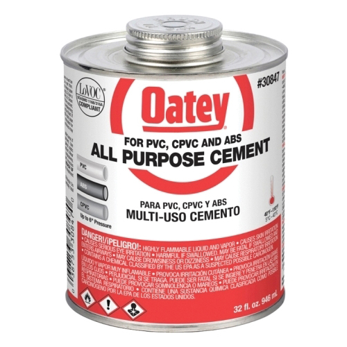 Oatey® all-purpose ABS, PVC and CPVC medium bodied clear cement is recommended for DWV, potable water and irrigation applications. Its medium body has excellent gap filling properties and is easy to apply with included in-lid dauber. This milky-clear, all-purpose cement can be used to solvent weld all schedules and classes of ABS, PVC and CPVC pipe and fittings up to 6 IN diameter with interference fit. Oatey products have earned the trust of plumbing professionals for over 100 YR.