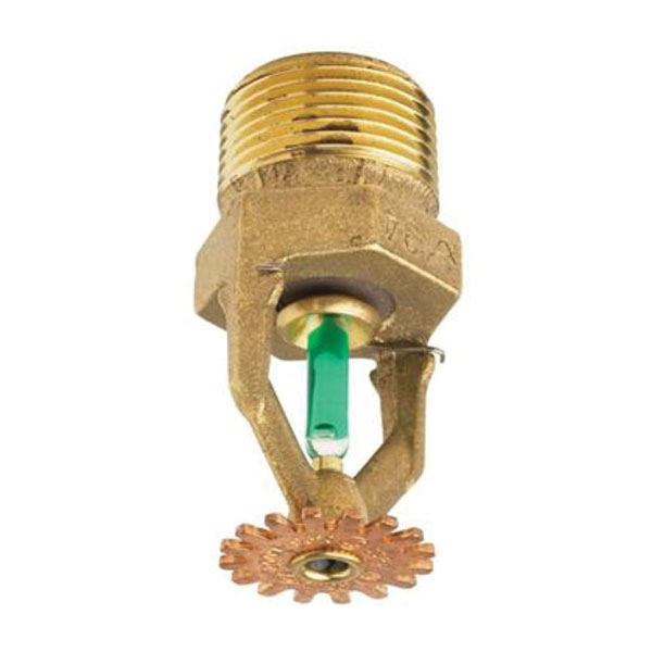 FireLock Standard Spray Sprinkler Head, Series/Model: Model V3405, Size: 3/4 IN, 17/32 IN Orifice, Connection Type: MNPT, 8 K Factor, Deflector Type: Pendent, Response Type: Standard, Maximum Pressure: 175 PSI, 5 MM Red Bulb Element, All Hazard, Wrench: V34 Recessed And Open End, Bronze Deflector, Die Cast Brass 65-30 Frame, Bulb Material: Glass With Glycerin Solution, Material Specification: Deflector: UNS C11000, Finish/Color: Plain Brass, Temperature Rating: 155 DEG F, 2-1/2 IN Height, Industry Standards: C/US UL Listed, FM, NYC/MEA 62-99-E, CSFM 7690-0531:112, VNIIPO And CTP Approved, Domestic/Import: Import, Additional Specifications: Minimum Operating Pressure: 7 PSI, Factory Hydrostatic Test: 100% At 500 PSI, Ambient Temperature Rating: 100 DEG F