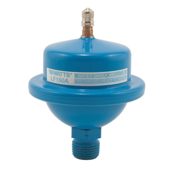 This 1/2 IN lead-free water hammer arrestor provides economical and effective single fixture protection used in residential or domestic water applications such as dishwashers, washing machines, and quick closing faucets. It is designed to control the water pressure shock and prevent water hammer conditions that are damaging to pipes and appliances. It consists of a stainless steel top and lower chamber, sealed-in diaphragm which flexes to absorb the shock, and a lead-free brass hex adapter for easy installation. This may be installed in new or existing plumbing systems vertically, horizontally or at any angle and should be installed as close to the shock source as possible, with one unit for each hot and cold water line up to 150 PSI (10.6 BAR) working pressure. It is factory air charged at 30 PSI (207 KPA) and is easily rechargeable with a standard tire valve connection and air-tight sealing cap.