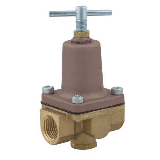 This 1/4 IN lead-free small water pressure regulator is used in small general purpose applications to regulate water pressure in piping systems using water and No. 2 fuel oil. It has an oversized orifice and is ideally used on beverage dispensing and paint spraying equipment, ice cube machines, humidifiers, drinking fountains, and other small process applications. It consists of a lead-free brass body with an adjusting tee handle, NPT threaded female connections, two-way low water pressure gauge port, aluminum spring cage, Buna-N stainless steel disc, and a reinforced Buna-N diaphragm. The reduced water pressure range is 3 - 50 PSI (0.2 - 3.4 BAR) and is factory set at 15 PSI (1 BAR).